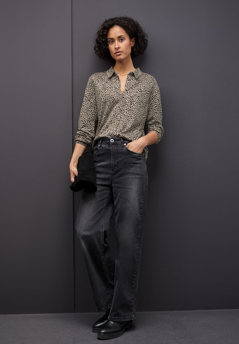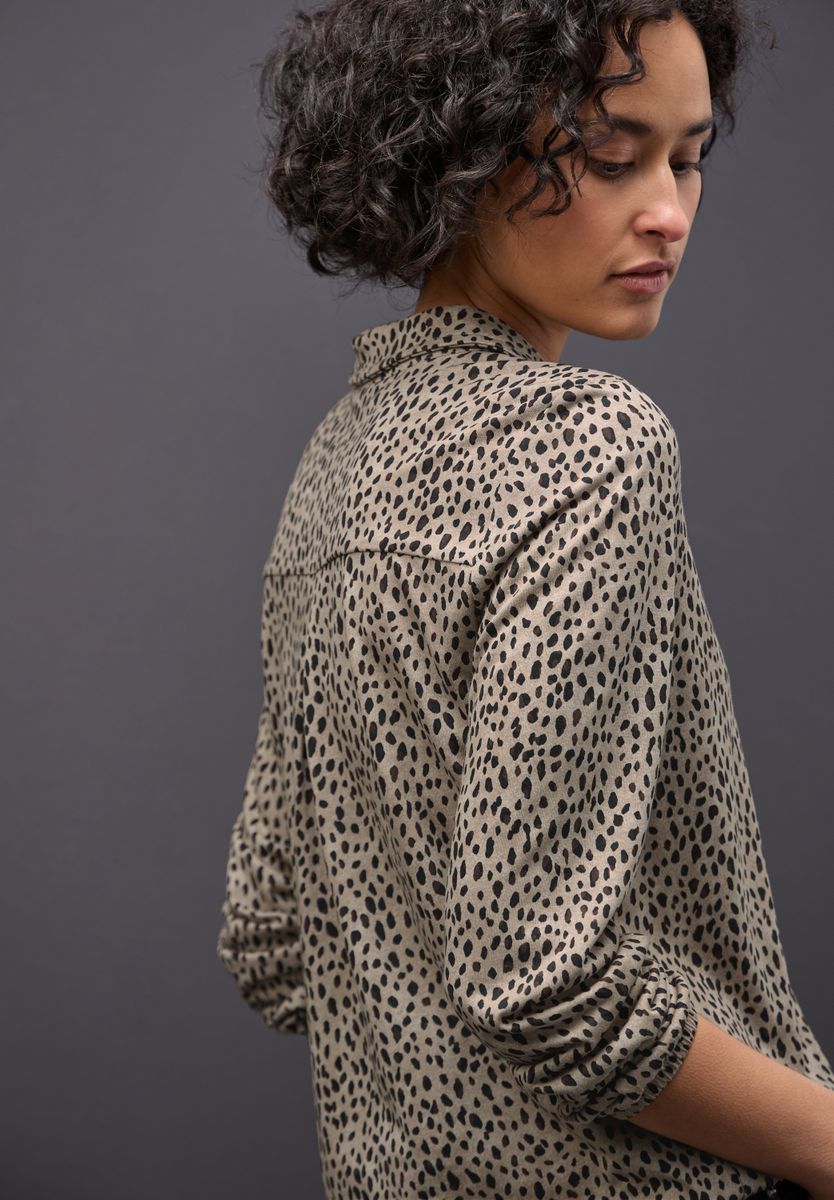 Das Tunika-Shirt von Street One für Damen kombiniert einen klassischen Hemdkragen mit verspieltem Leo-Print. Die Knopfleiste, der Tunnelzug am Saum und die elastischen Bündchen verleihen dem Shirt eine lässige Passform. Die softe Jersey-Qualität mit Modal-Anteil bietet dir ein rundum angenehmes Tragegefühl. Jerseyshirt mit Knopfleiste Hemdkragen Langarm mit elastischen Bündchen Tunnelzug am Saum Softer Baumwoll-Modalmix Material: 50% Baumwolle, 50% Modal FARBNR