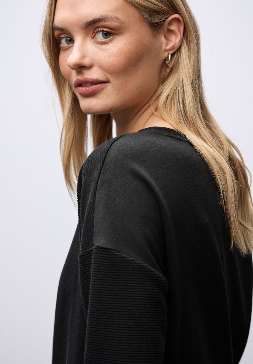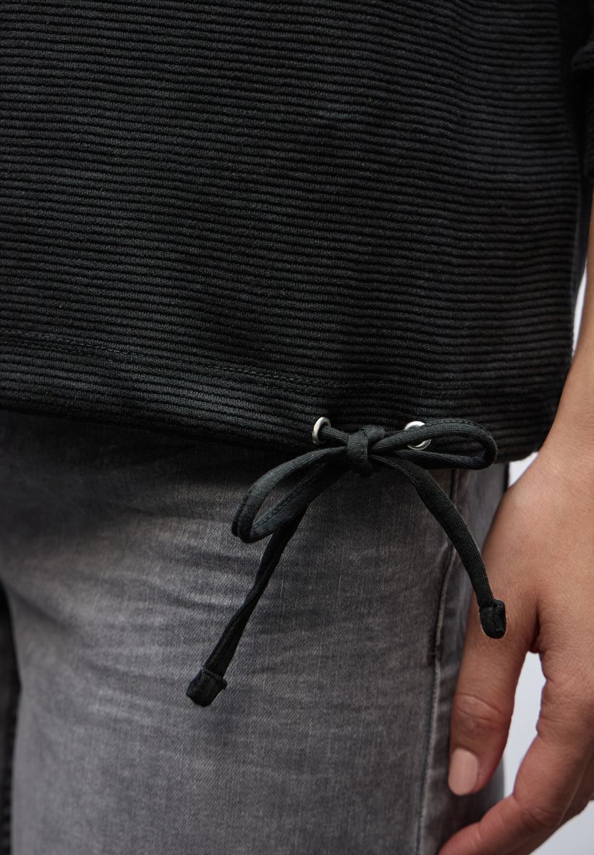 Das Strukturmix Shirt von Street One für Damen kombiniert eine moderne Streifenstruktur auf der Front mit glatter Jersey-Qualität auf der Rückseite. Der Tunnelzug am Saum sorgt für eine individuelle Passform, während der U-Boot-Ausschnitt und die 3/4-Ärmel den Look abrunden. Ideal für stylische Alltags-Outfits mit besonderer Textur. Damenshirt mit Tunnelzug am Saum U-Boot-Ausschnitt 3/4-Arm Streifenstruktur auf der Vorderseite Glatte Jersey-Qualität auf der Rückseite Material: 70% Baumwolle, 30% Polyester FARBNR