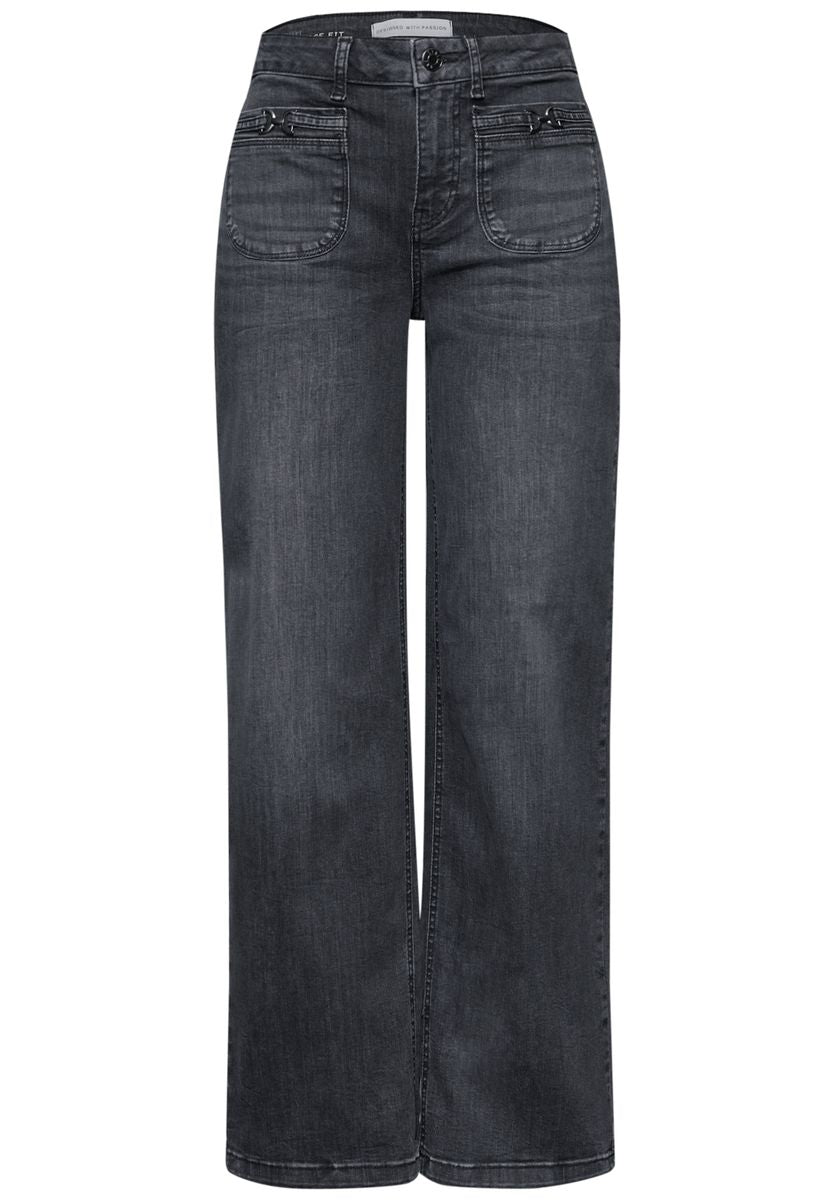 Diese Wide Leg Jeans von Street One für Damen bringt mit ihrer grauen Waschung und den aufgesetzten Taschen mit Schnallendetail moderne Lässigkeit in deinen Kleiderschrank. Der Loose Fit mit hoher Taille sorgt für bequemen Sitz und angesagten Look. Die Wide Legs verleihen der Jeans nicht nur modisches Flair, sondern überzeugen auch mit einem angenehmen Tragegefühl. Jeanshose im Loose Fit High Waist und Wide Legs Aufgesetzte Taschen mit Schnallendetail Graue Waschung Baumwollmix mit Stretchnateil Material: 82% Baumwolle, 15% Polyester, 3% Elasthan