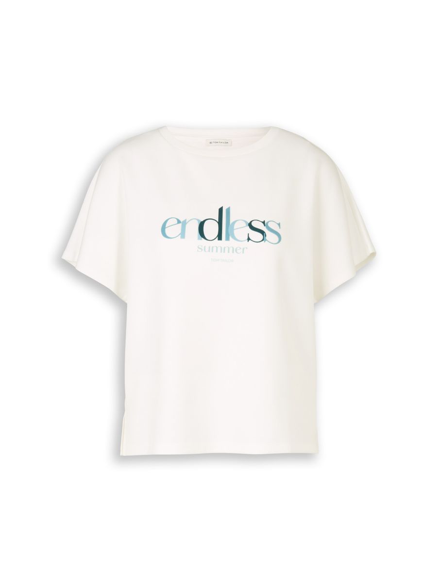 Locker geschnittenes T-Shirt mit Textprint auf der Brust und kurzen Seitenschlitzen. Aus einem weichen, knitterarmen und elastischen Scuba-Stoff. FARBNR